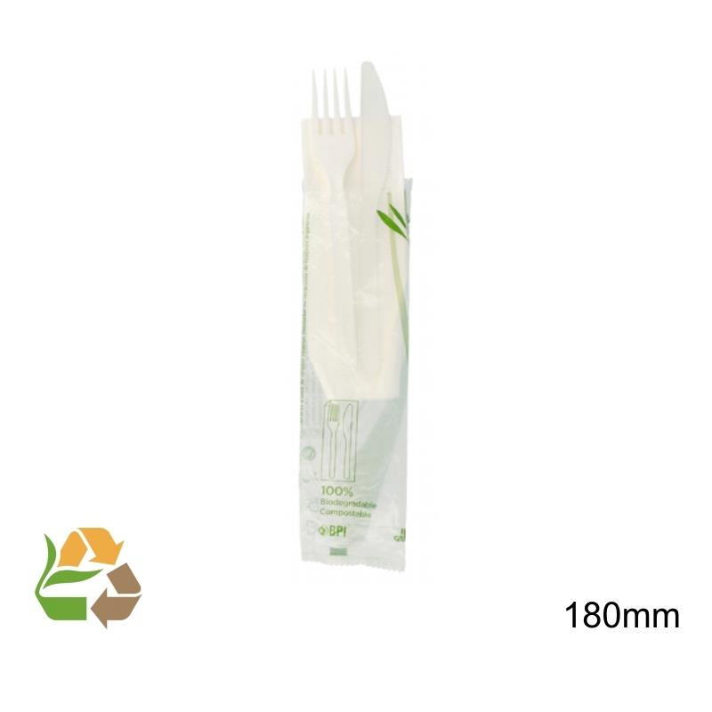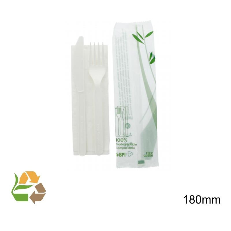 Set de tenedor, cuchillo y servilleta fabricados a partir de CPLA, material 100% recicable.