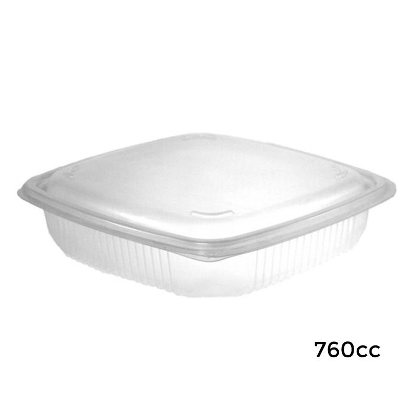 Presentación: Tarrina bisagra de plástico de 760cc en cajas de 300 unidades.