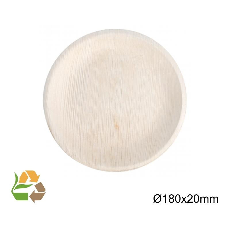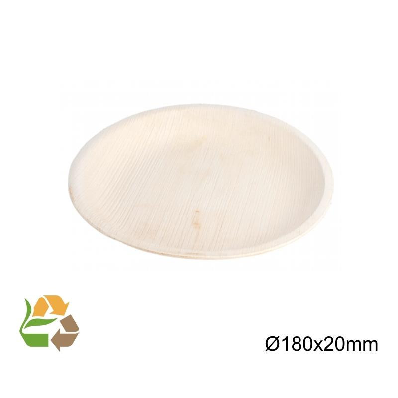 Descripción: Plato Redondo desechable fabricado con Hoja de Palma de tamaño Ø180x25mm.