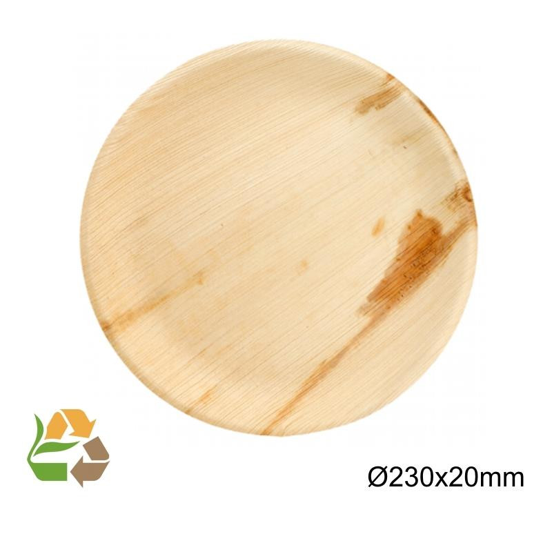 Plato Redondo desechable fabricado con Hoja de Palma; un material Biodegradable compostable.